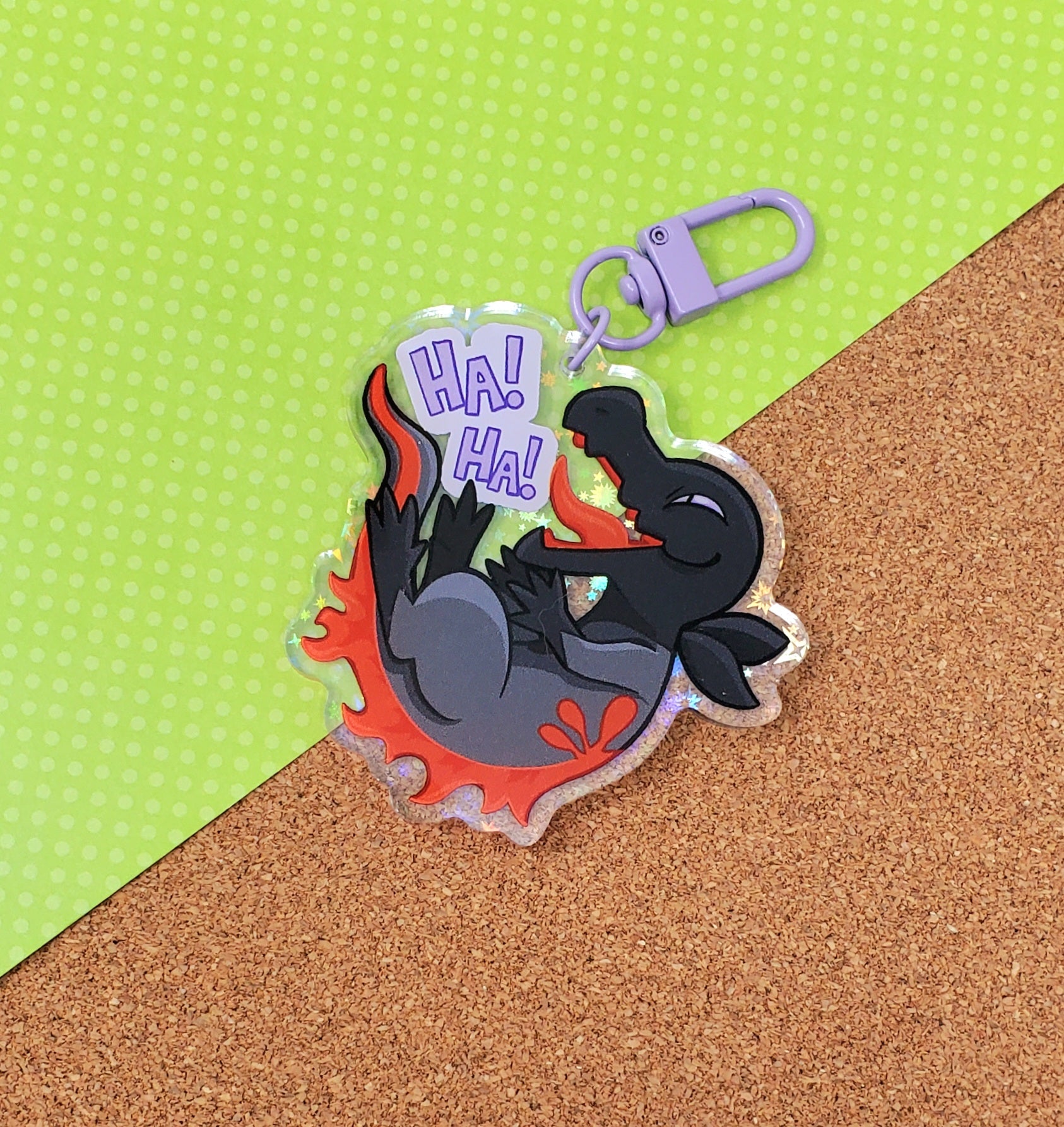 Double-sided charm, printed on clear acrylic, with one side featuring the shiny version with holo stars. The keychain is approximately 2.5". Comes with attached purple keychain clasp.